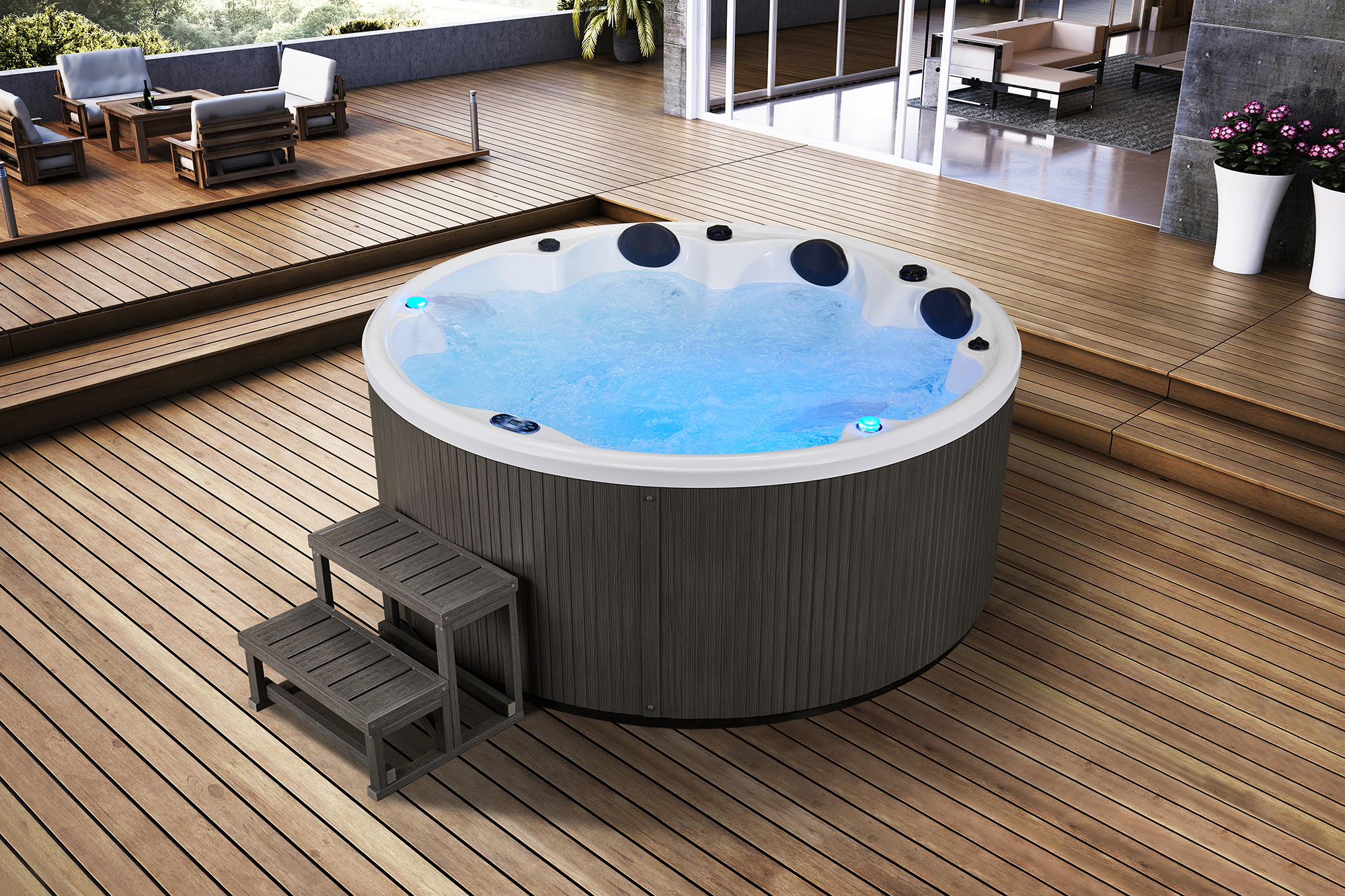 MEXDA WS-097 – Круглый гидромассажный СПА-бассейн для улицы и дома. Отлично подойдет для дачи, можно установить в саду, на террасе. Водные СПА-процедуры и гидромассаж в любое время и не зависимо от погоды.