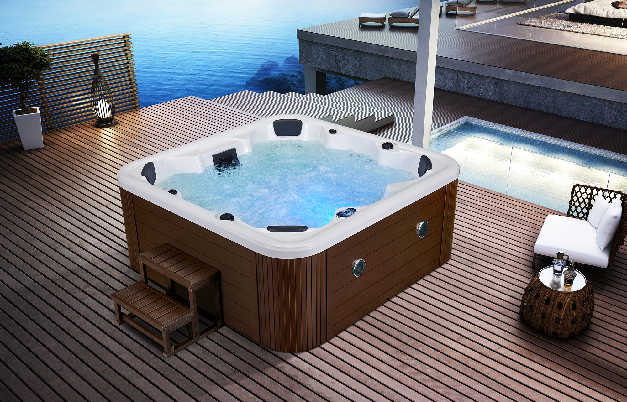 Гидромассажный СПА-бассейн для улицы и дома. Возможность установки в саду, на террасе либо внутри помещения. Водные СПА-процедуры и гидромассаж в любое время года.