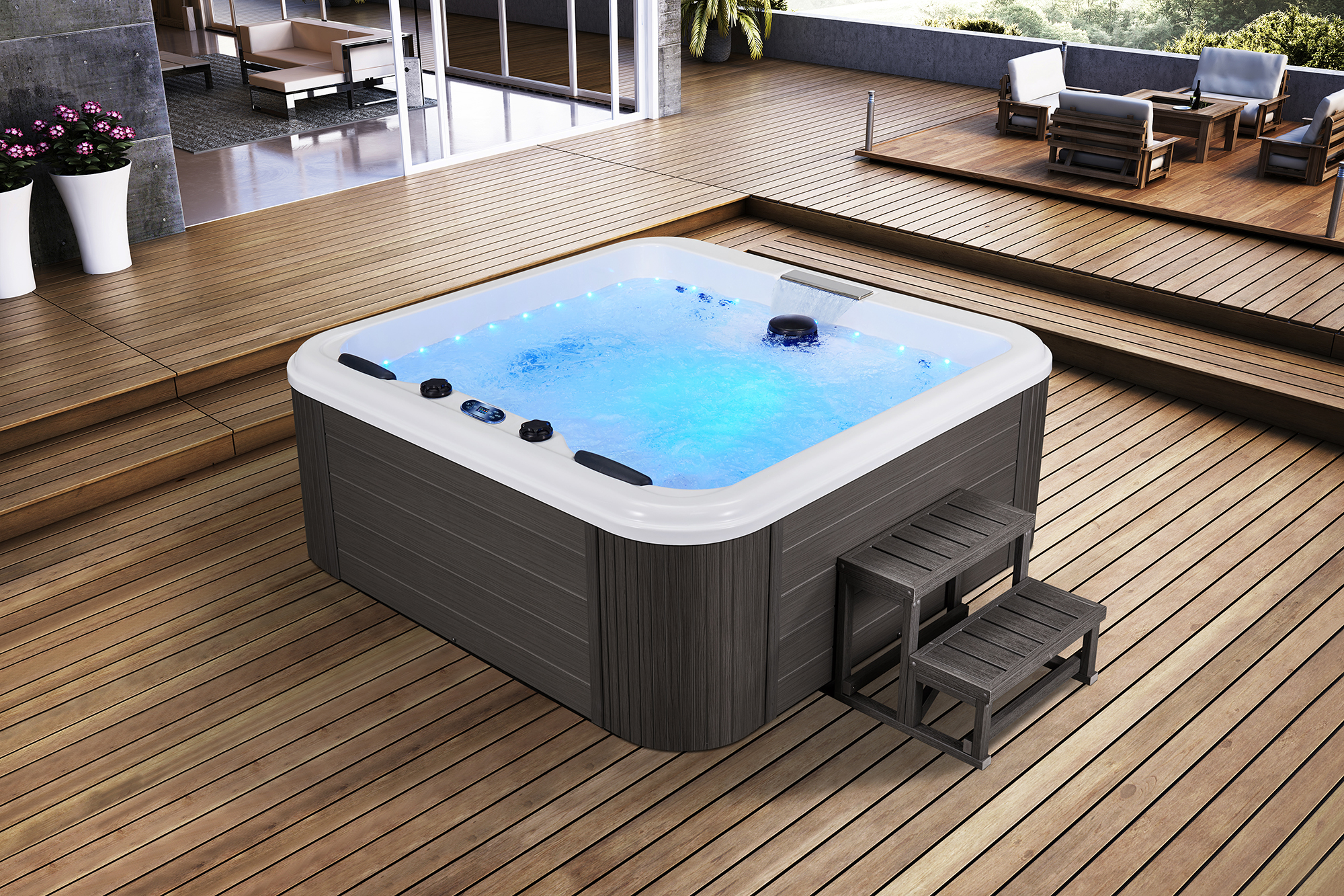 Гидромассажный СПА-бассейн для улицы и дома. Возможность установки в саду, на террасе либо внутри помещения. Водные СПА-процедуры и гидромассаж в любое время года.