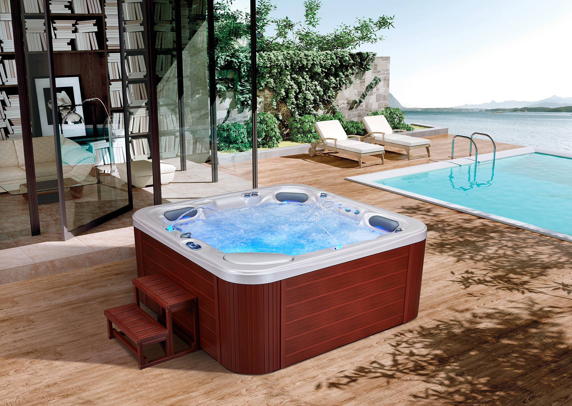 Гидромассажный СПА-бассейн для улицы и дома. Возможность установки в саду, на террасе либо внутри помещения. Водные СПА-процедуры и гидромассаж в любое время года.